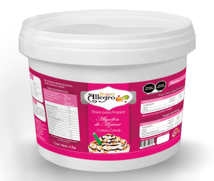 Presentada en un práctico formato de 3 kg, esta base es perfecta para preparar múltiples porciones, ya sea en casa o en tu negocio. Su fácil preparación te permitirá ofrecer a tus clientes o familiares un frappé de algodón de azúcar que les hará recordar esos momentos especiales.
